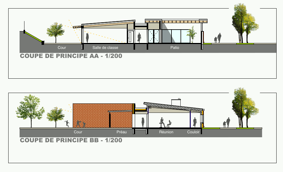 Le principe général du projet consiste à prolonger le volume existant, l’absorber dans un volume neuf qui transforme son image et réorganise l’école et les nouvelles classes vers les espaces récréatifs et paysagers.